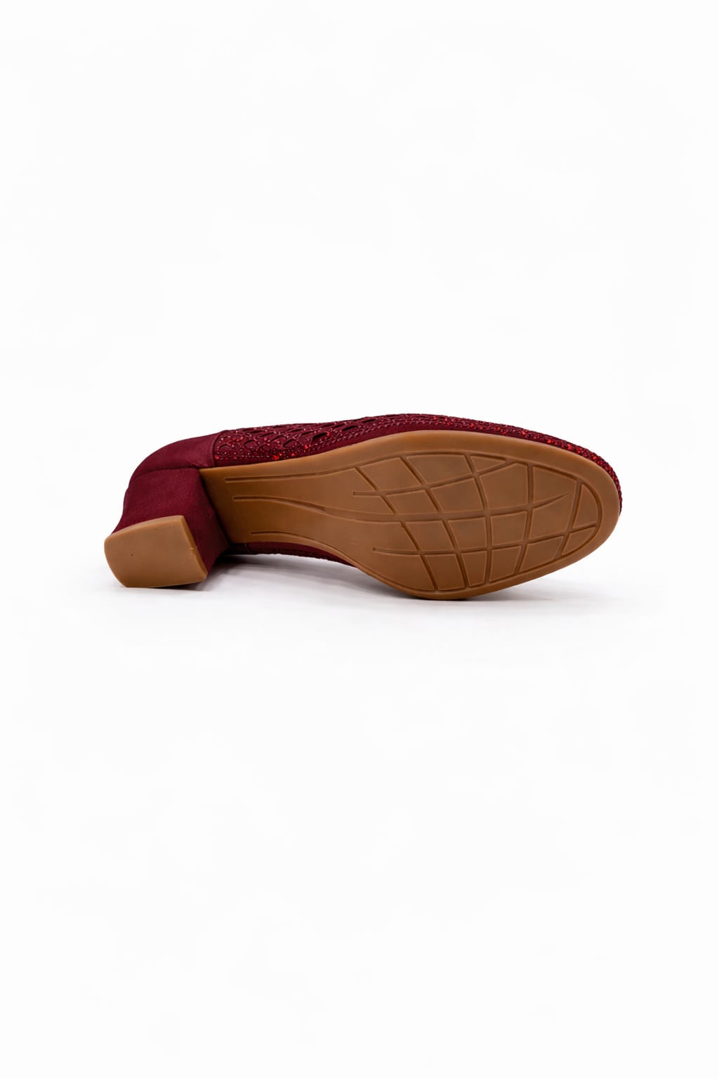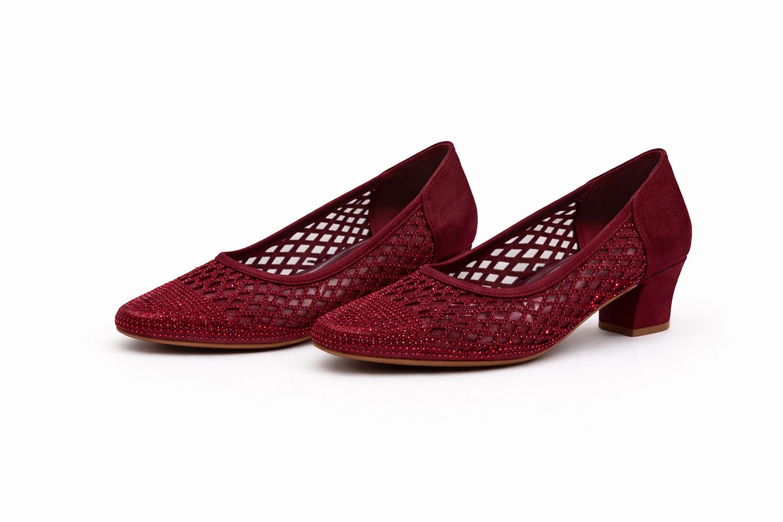 Bordo rengin asil duruşunu file yüzey ve zarif taş detaylarıyla buluşturan bu kadın ayakkabı, şıklığı ön planda tutanlar için tasarlanmıştır. Nefes alabilen file yapısı sayesinde ferah bir kullanım sunarken, orta yükseklikteki blok topuğu dengeli ve rahat bir yürüyüş sağlar. Kapalı burun formu ile hem günlük kullanımda hem de özel davetlerde şık bir tamamlayıcıdır.