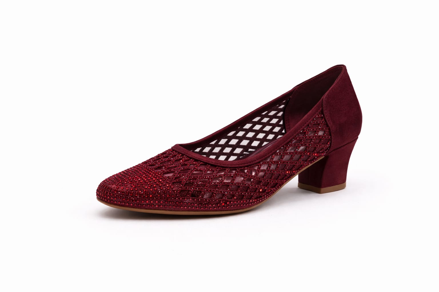 This women’s shoe blends the elegance of burgundy with breathable mesh and delicate crystal details. The mesh upper ensures comfort and airflow, while the mid-height block heel offers balance and stability. Its closed-toe design makes it a stylish choice for both everyday wear and special occasions.
