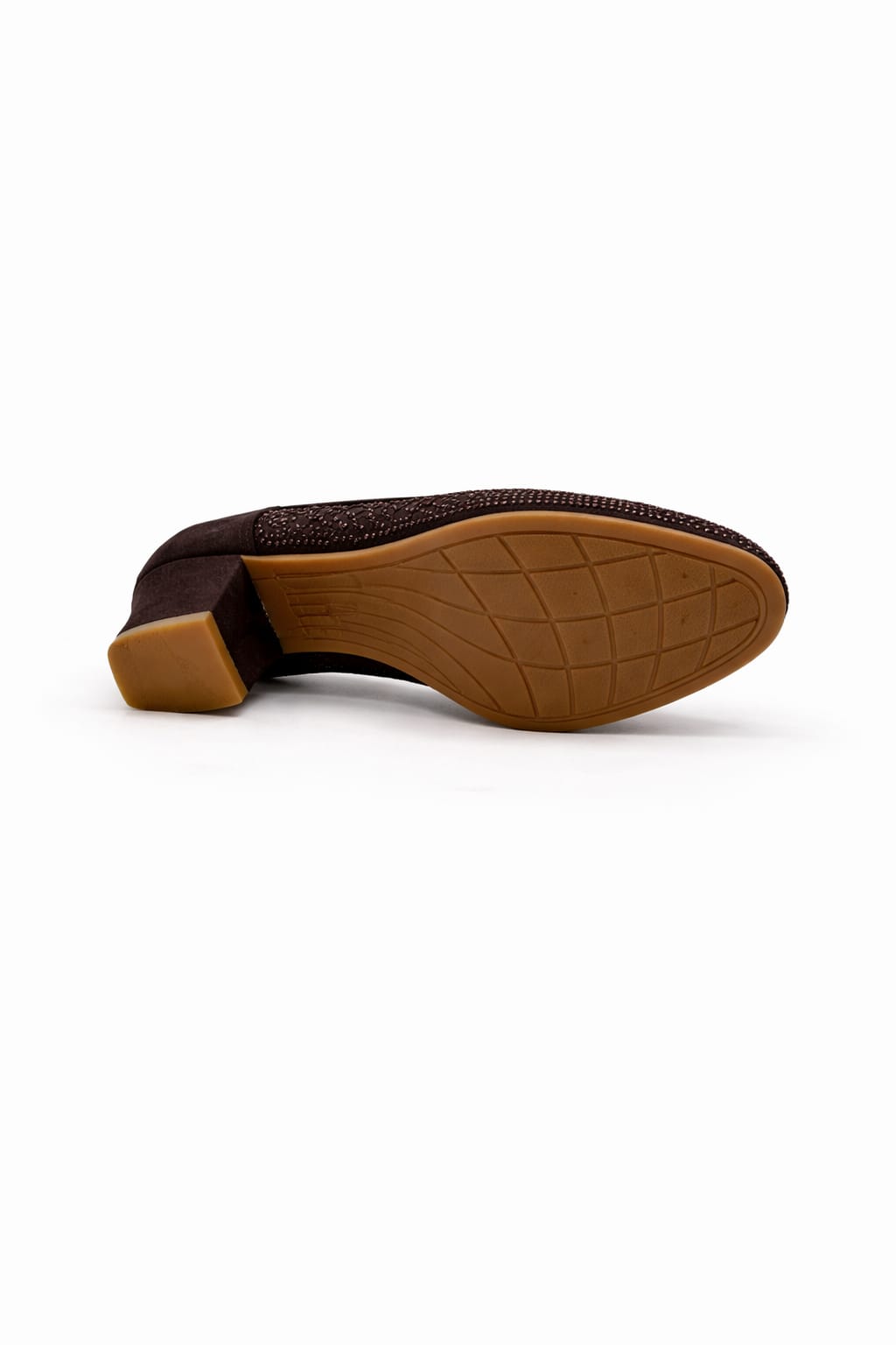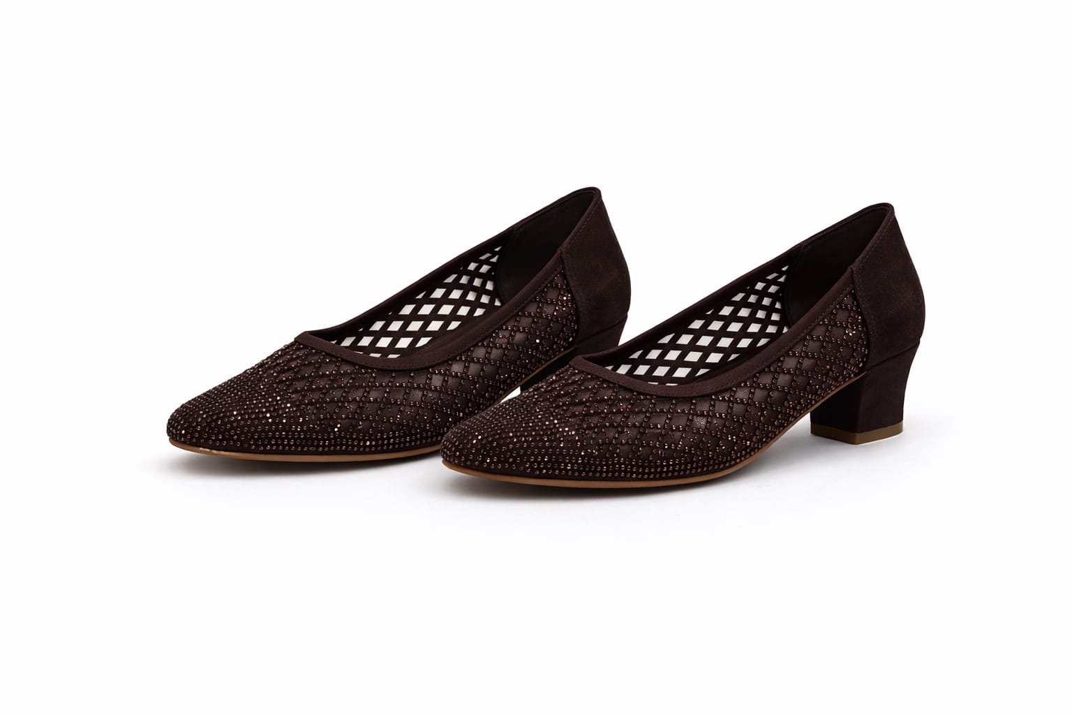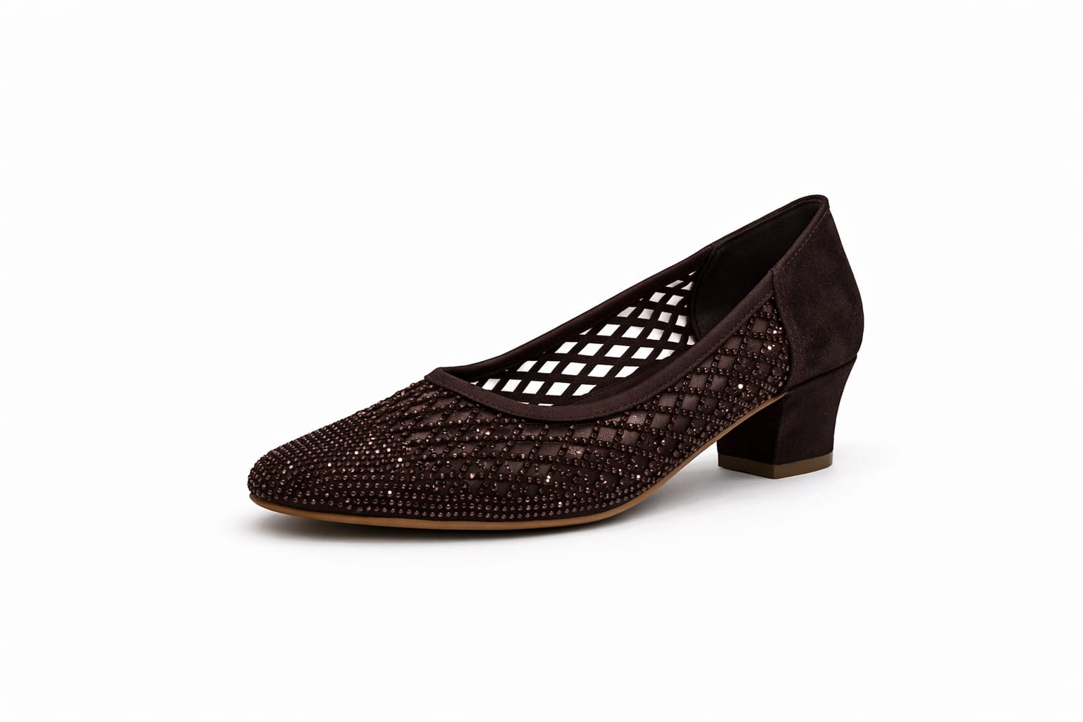 This women’s shoe offers a warm and elegant look in dark brown tones, highlighted by a breathable mesh upper and delicate crystal details. The mesh structure enhances airflow, while the mid-height block heel ensures balance and comfort. Its closed-toe design makes it suitable for office wear and special occasions alike.
