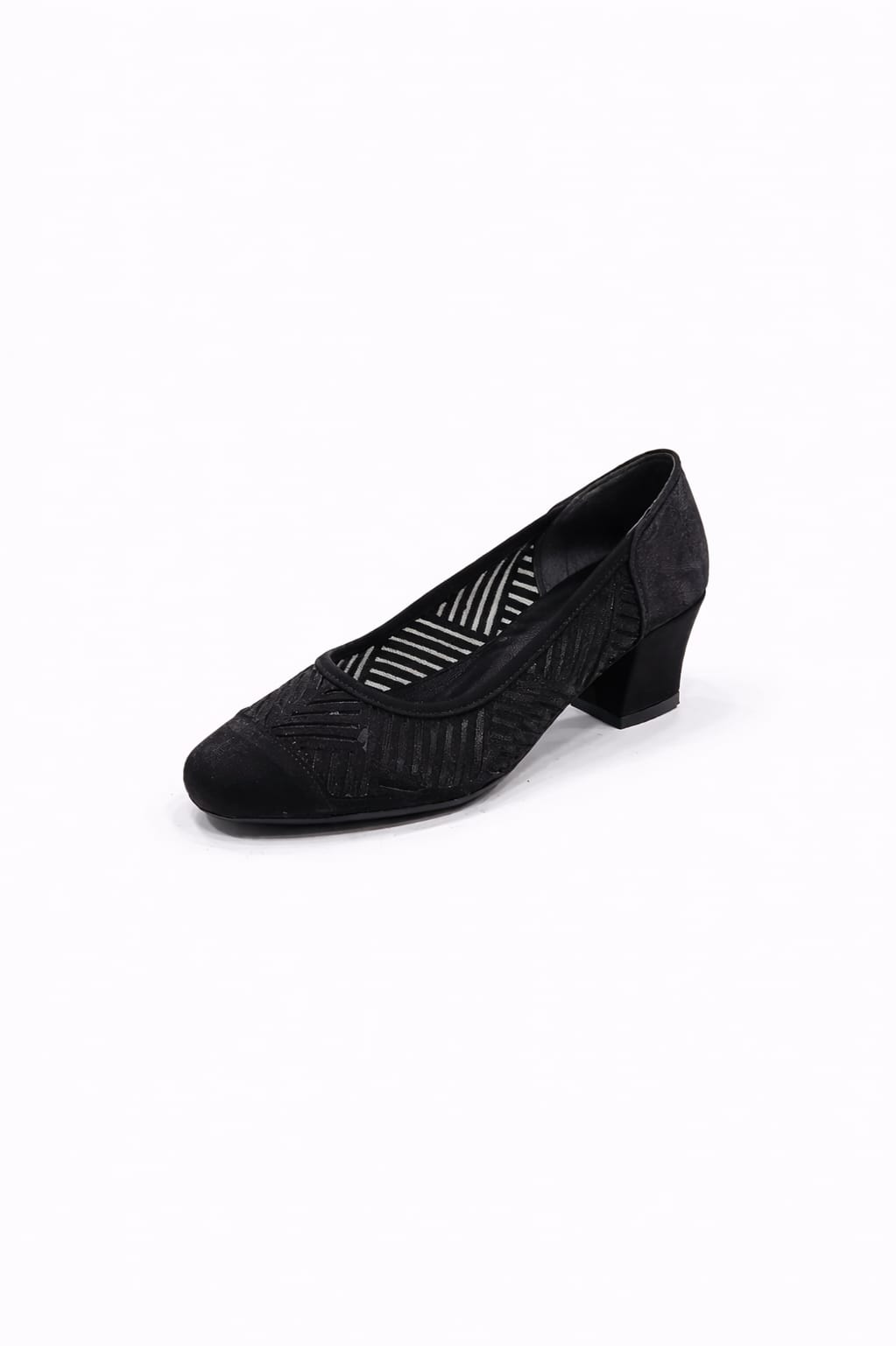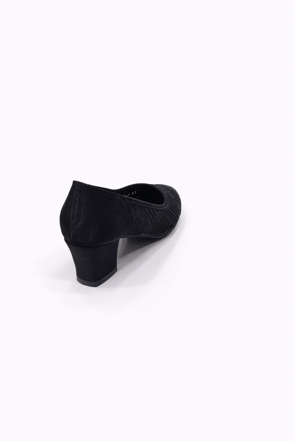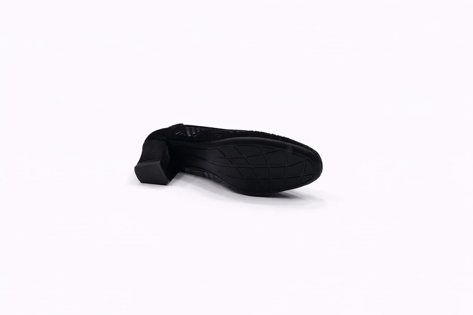 This women’s shoe enhances classic black elegance with a geometric textured surface for a modern and refined look. The breathable inner structure ensures comfort throughout the day, while the mid-height block heel provides balance and stability. Its closed-toe design makes it ideal for office wear as well as everyday use.