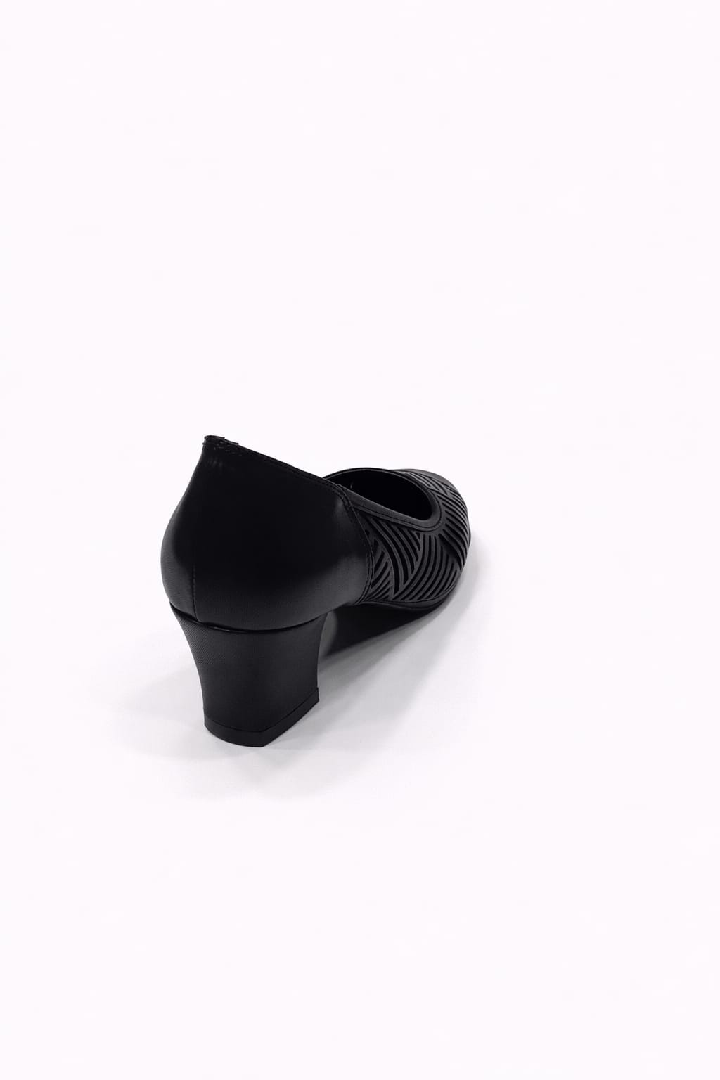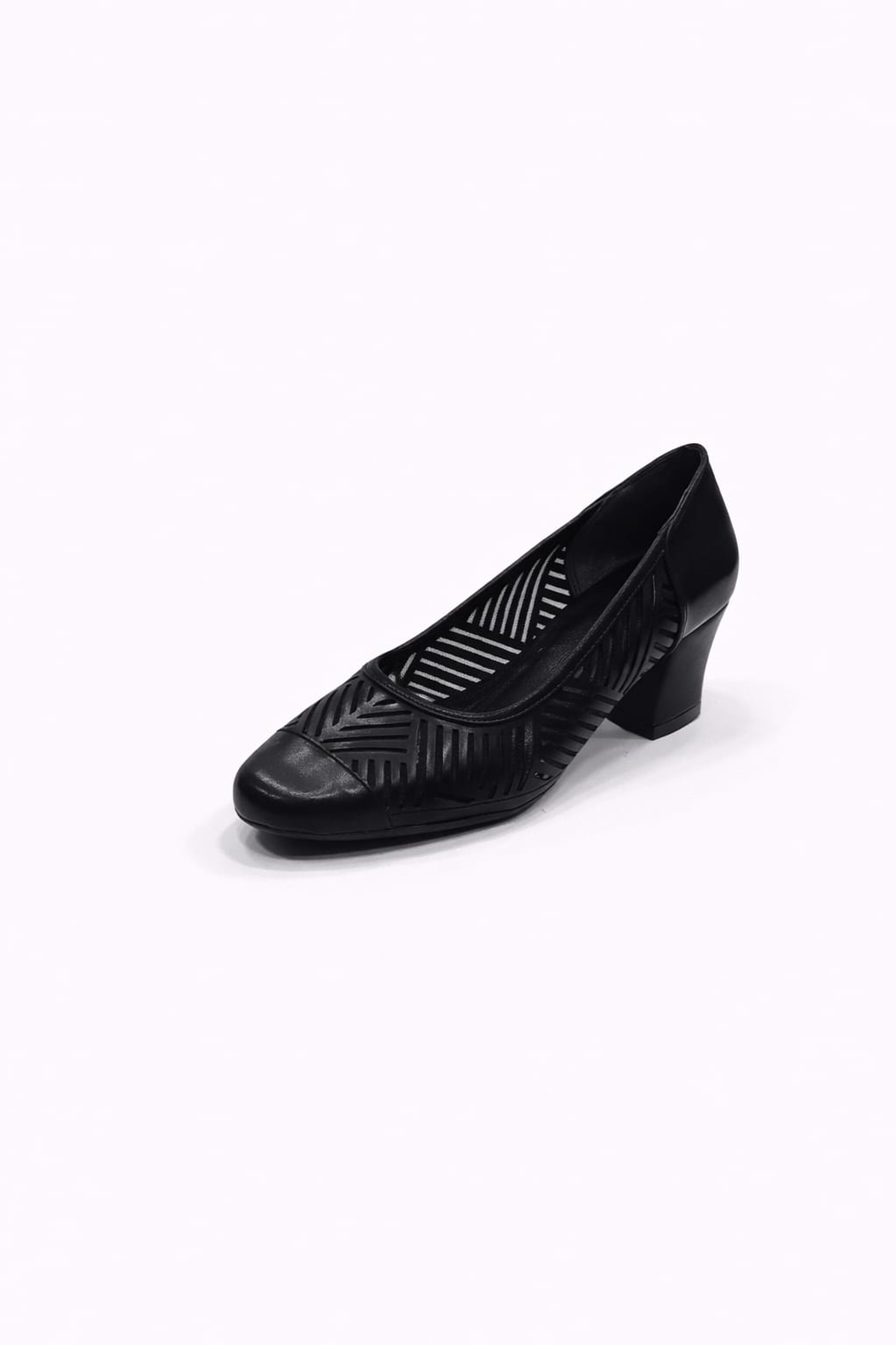 This women’s shoe highlights timeless black elegance with geometric cut-out details on the surface. Its breathable structure ensures all-day comfort, while the mid-height block heel provides balance and stability. The closed-toe design makes it suitable for office wear as well as everyday outfits.