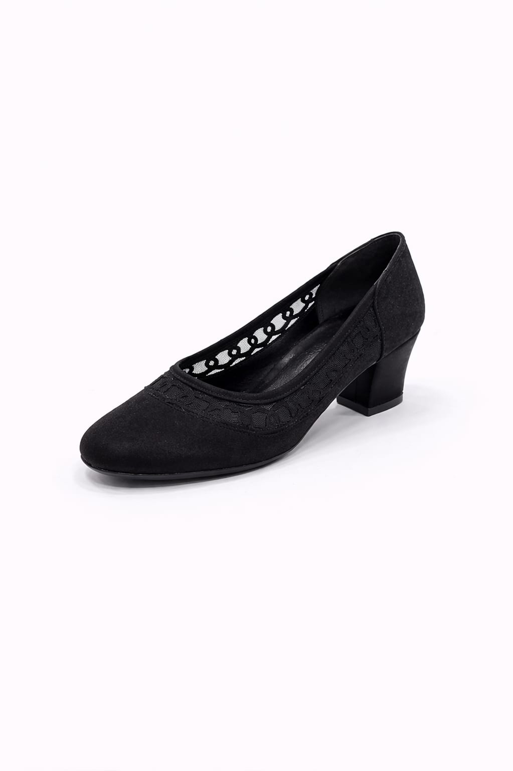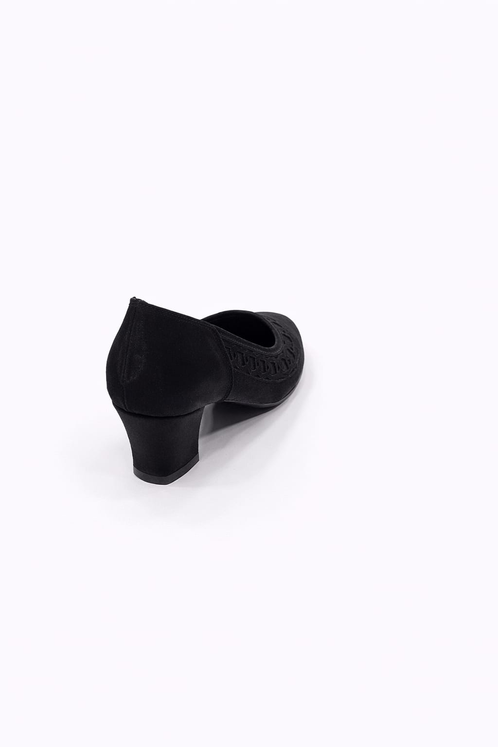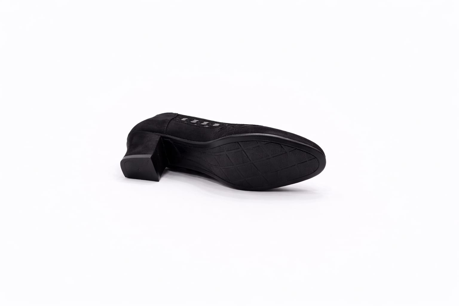 Designed with a black suede upper and chain-pattern laser cut side details, this women’s shoe offers a refined and professional look. The breathable side panels ensure comfort throughout the day, while the mid-height block heel provides balance and stability. Its closed-toe design makes it ideal for office wear and everyday outfits.